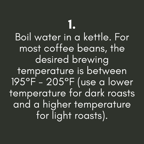 - Boil water in a kettle. For most coffee beans, the desired brewing temperature is between 195°F - 205°F (use a lower temperature for dark roasts and a higher temperature for light roasts).
