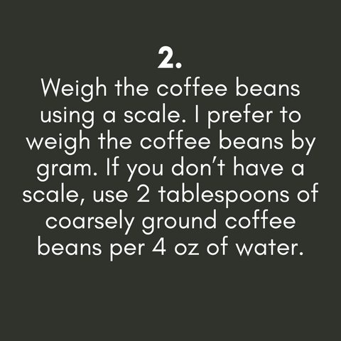 - Weigh the coffee beans using a scale. I prefer to weigh the coffee beans by gram. If you don’t have a scale, use 2 tablespoons of coarsely ground coffee beans per 4 oz of water.