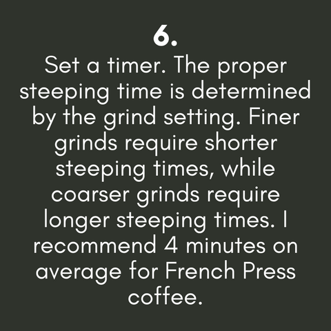 - Set a timer. The proper steeping time is determined by the grind setting. Finer grinds require shorter steeping times, while coarser grinds require longer steeping times. I recommend 4 minutes on average for French Press coffee.