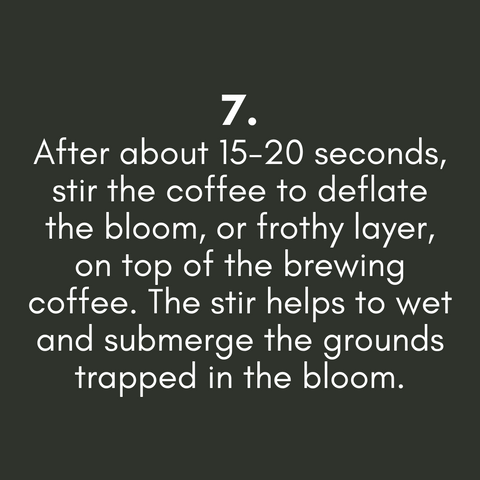 - After about 15-20 seconds, stir the coffee to deflate the bloom, or frothy layer, on top of the brewing coffee. The stir helps to wet and submerge the grounds trapped in the bloom.