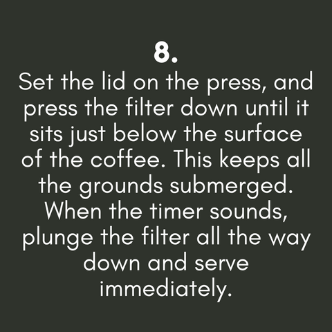 - Set the lid on the press, and press the filter down until it sits just below the surface of the coffee. This keeps all the grounds submerged. When the timer sounds, plunge the filter all the way down and serve immediately.