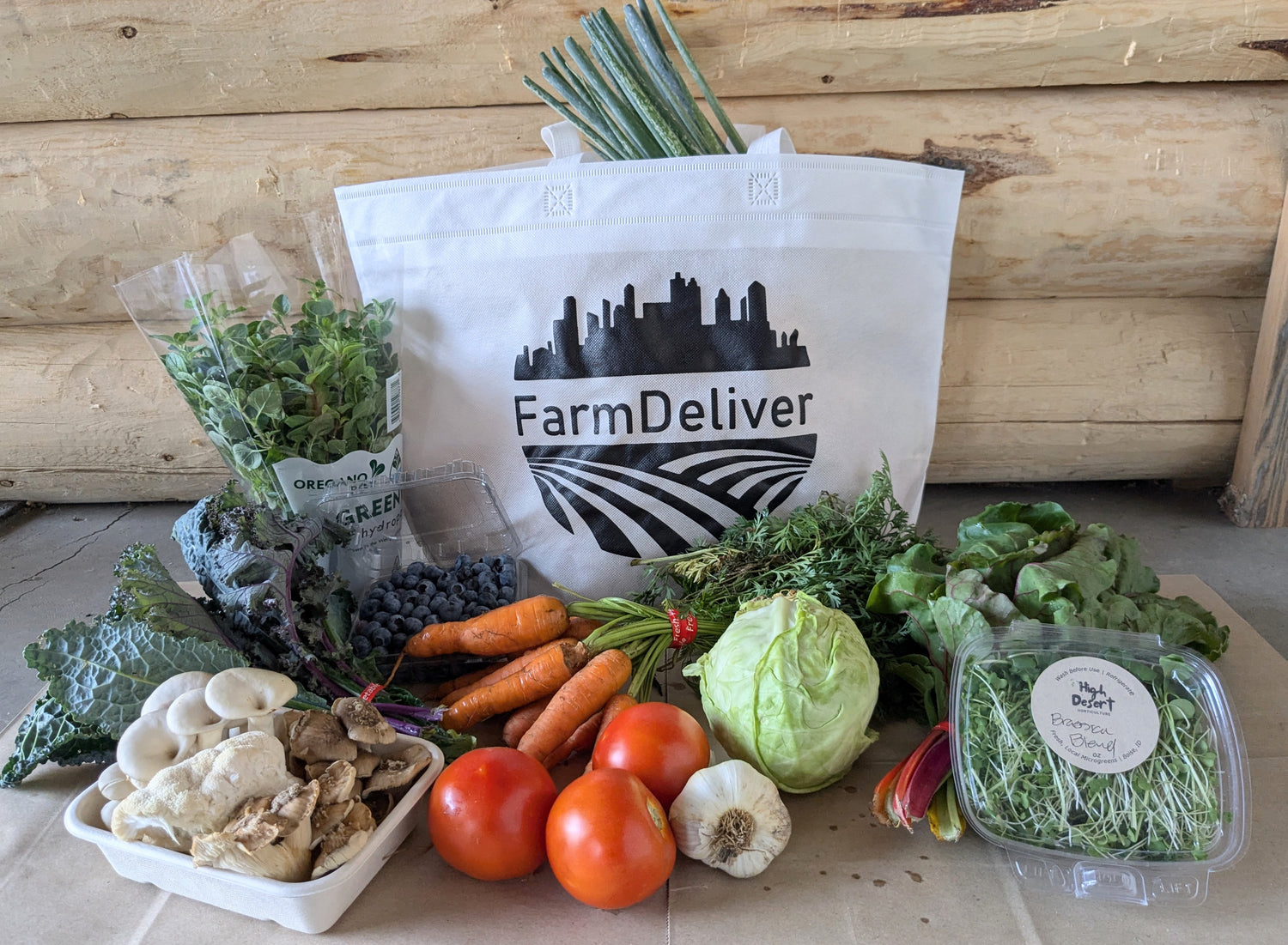 A variety bundle of locally grown produce that includes 7-10 seasonal items such as mushrooms, fruit, microgreens, root vegetables, leafy greens, and herbs. Add meat, dairy, bread and more.