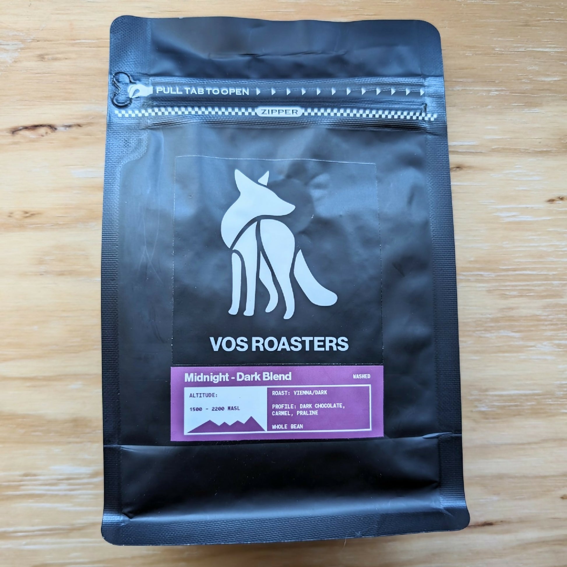 Vos Roasters flagship dark roast, 6oz bag great for French press and drip coffee.