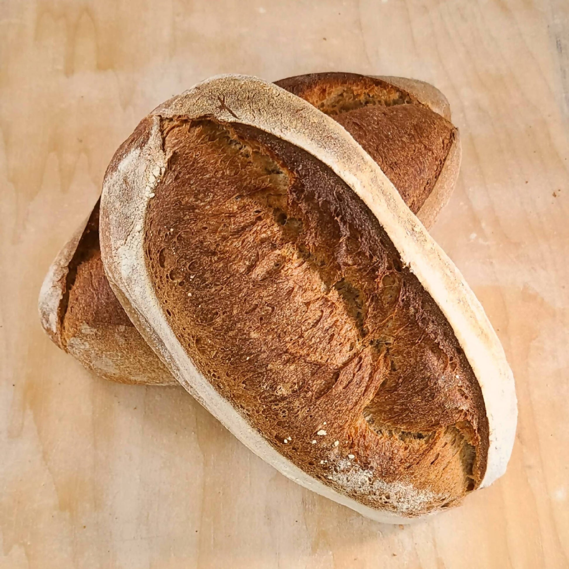 We leaven this dough over two days to create a hearty whole wheat sourdough. While not gluten free, this loaf is most highly recommended for those with gluten sensitivities.
