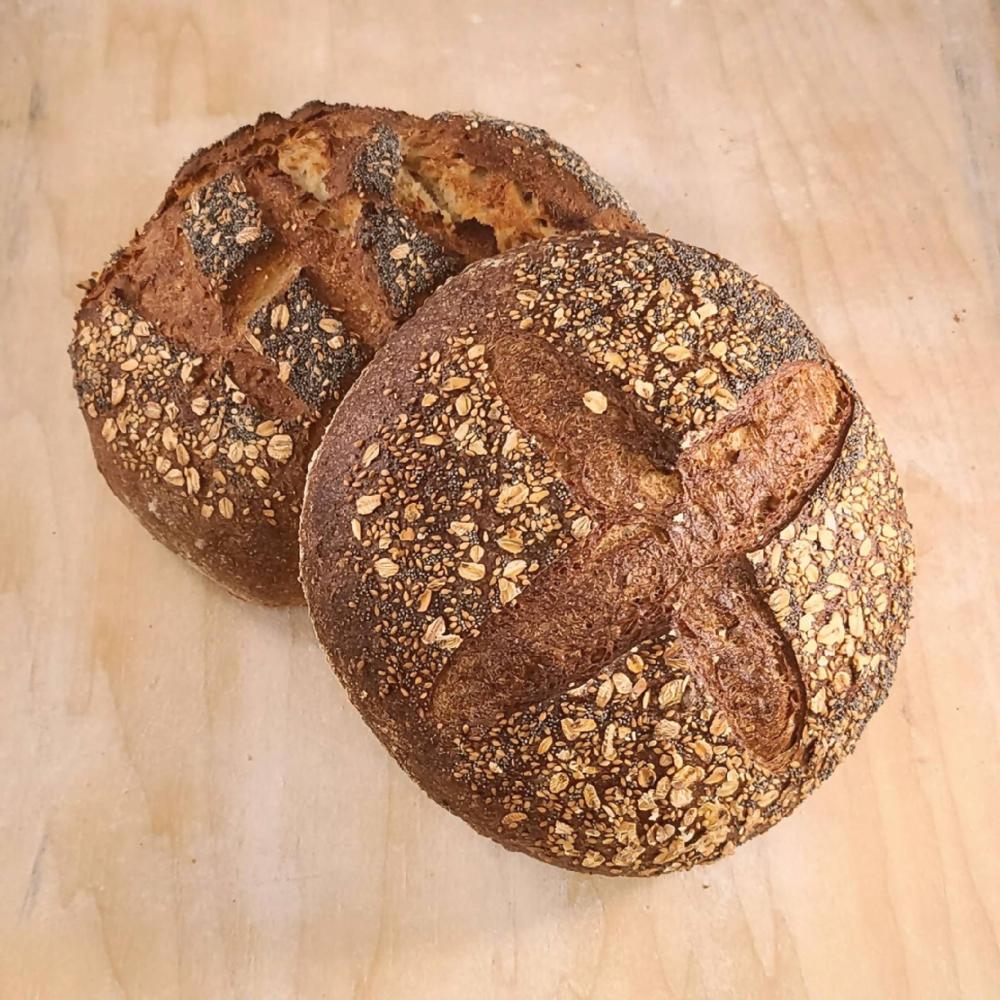 100% Organic seeded multigrain loaf in a round boule shape. This hearty loaf uses our house-milled whole wheat flour.
