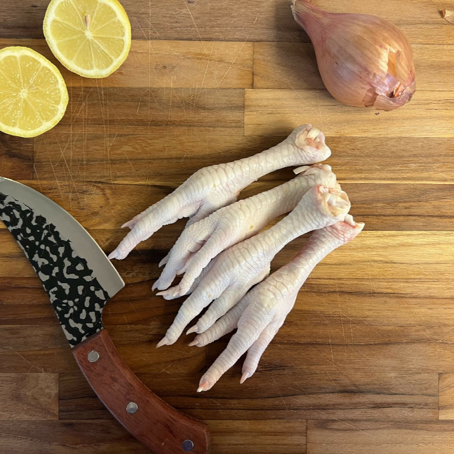 Air-chilled and vacuum sealed packages of free-range pastured chicken feet, great for chicken stock, soups and bone broth.