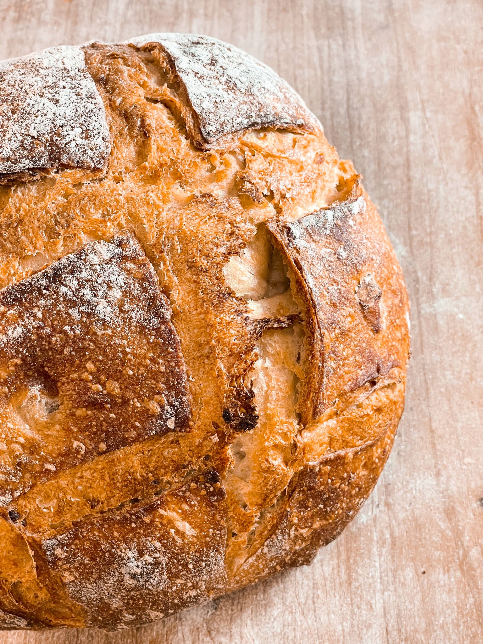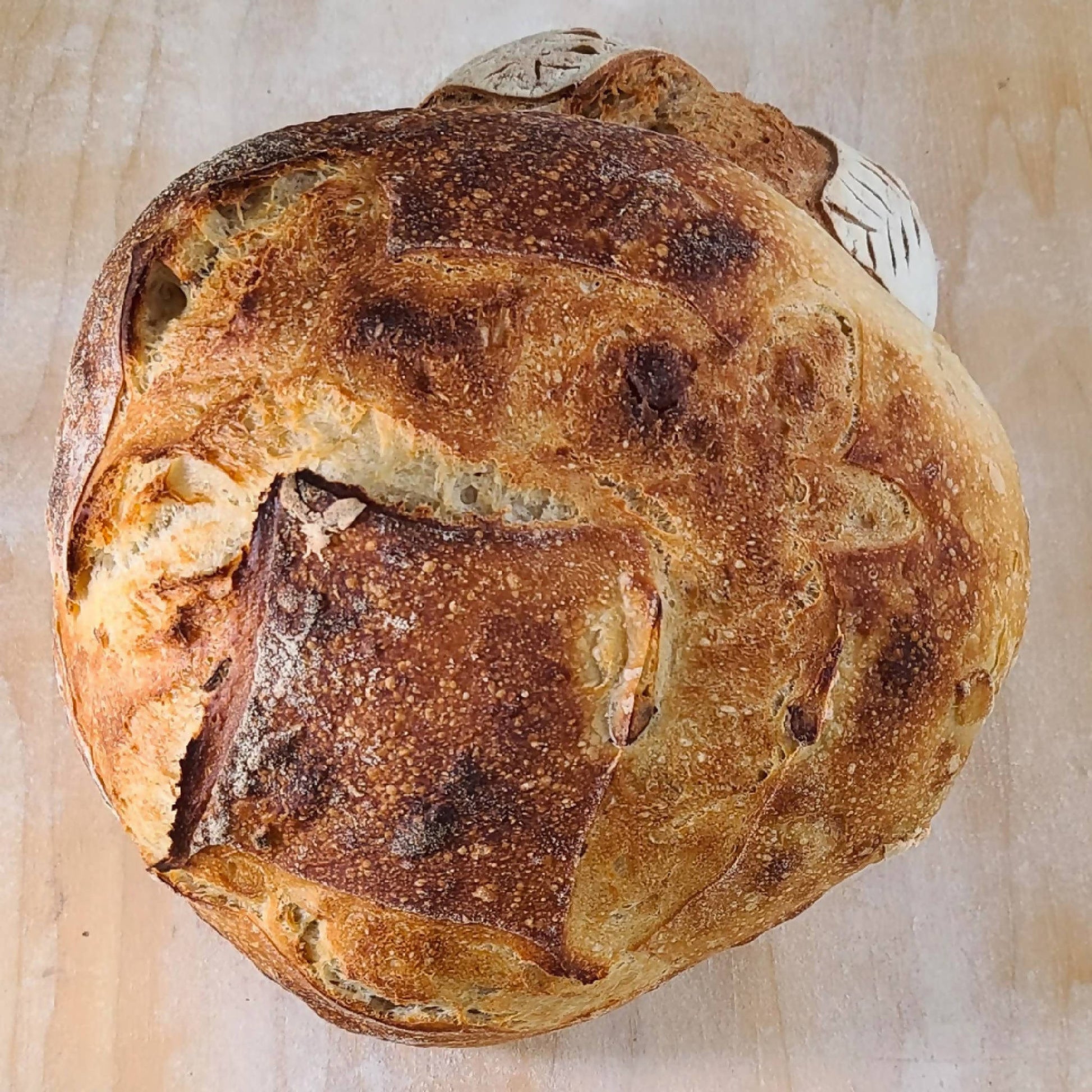 Rustic boule with a chewy crumb and crust. Roasted Idaho potatoes baked throughout the loaf.