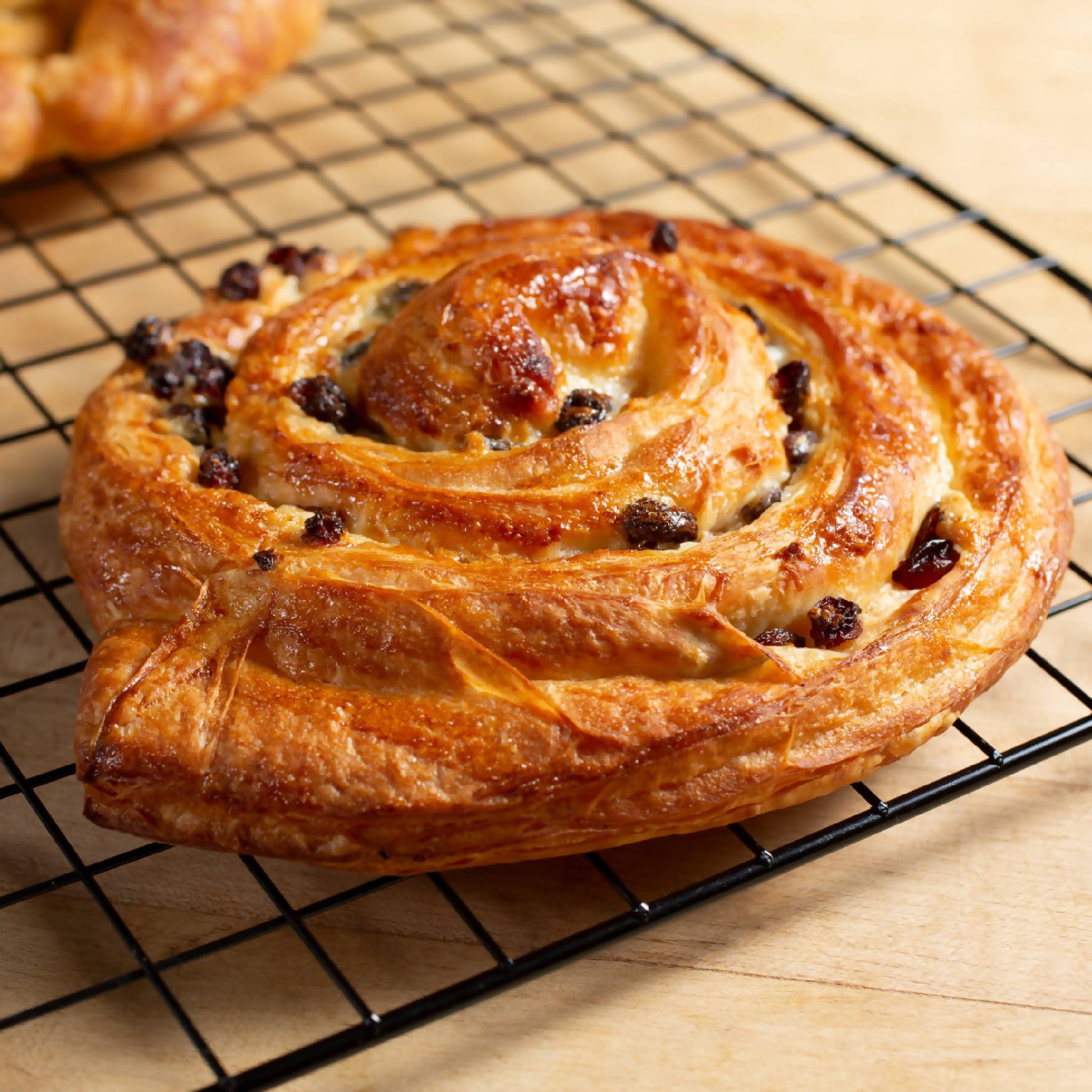 Raisins rolled into classic pastry dough and topped with an apricot glaze.