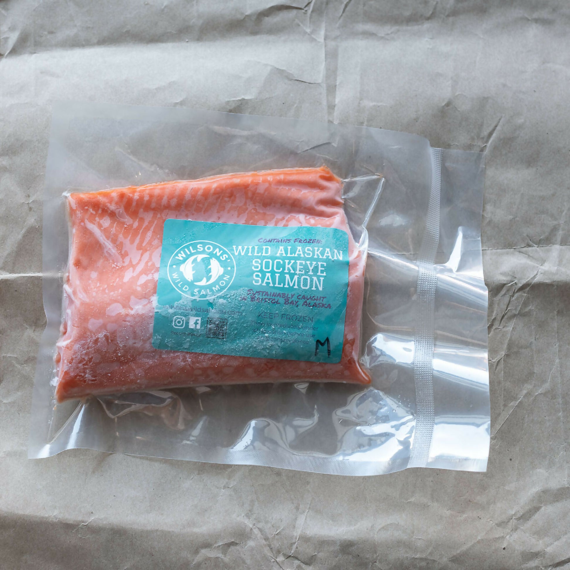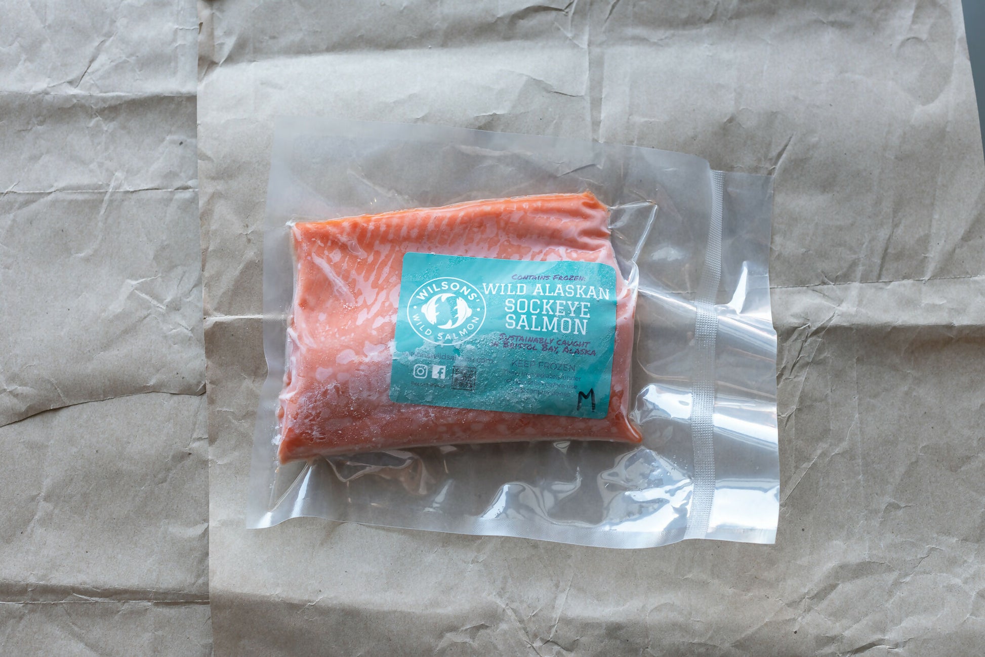 Half of a fillet of frozen sockeye salmon, either the tail or body piece