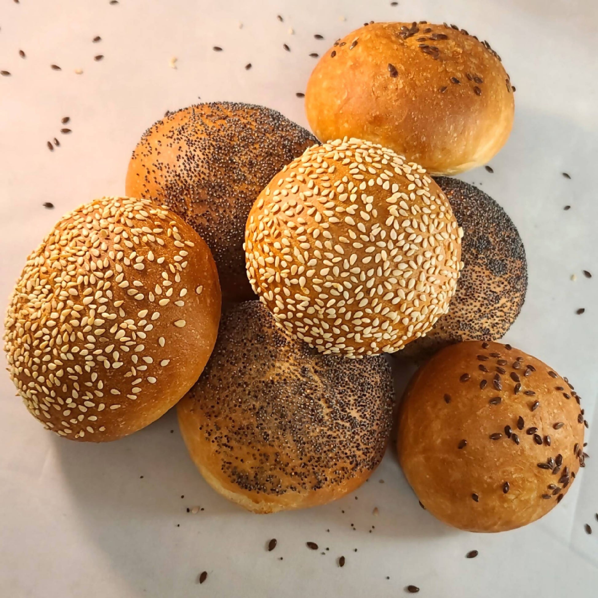Assorted dinner rolls of nutritious white bread with tasty seeds sprinkled on top.